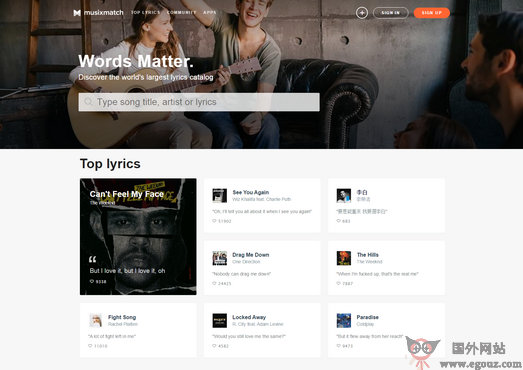 Musixmatch 网站是一个致力于发现世界是最多、最全面的音乐歌词数据库平台,你可以搜到到绝大多数音乐的歌词。同时还提供手机应用可以在你播放音乐的时候同步显示歌词,也可以在当你听电台、看视频,甚至路边音乐时,自动识别并同步显示歌词。