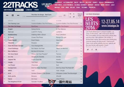 22tracks:在线DJ音乐舞曲平台是一个致力于分享互联网音乐舞曲的平台,由120个来自世界各地的音乐人士共同打造,多种风格的背景音乐全部,免费收听,并且每周都有有更新,提供22种不同风格的曲风音乐。