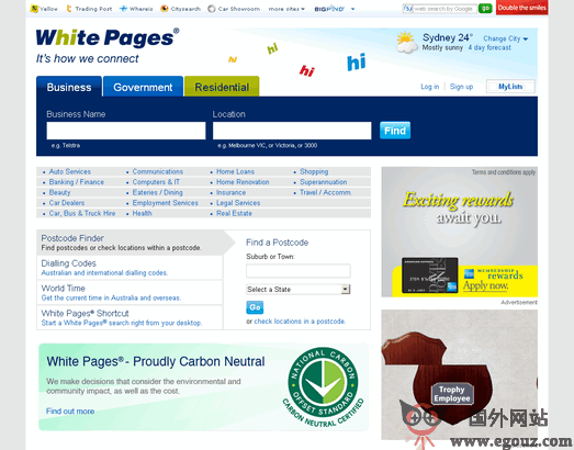 提供澳大利亚电话的数据库,陈列澳大利亚所有城市和城镇的电话号码,区号,邮政编码,还陈列联邦政府和州政府的电话号码。