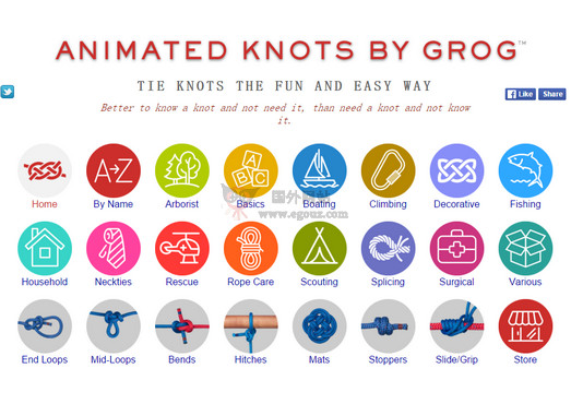 绳子打结(Animated Knots)是一个适用于生活和户外工作的综合站点,提供丰富的绳子打结知识,通过图文教学的方式来快速学习如果更好的打结方法,该网站汇集了20多种不同的分类。