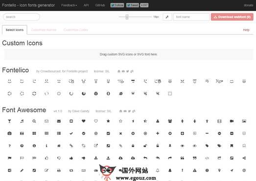 Fontello:免费图标素材生成工具是一个免费Web-font 图标大集合,设计师不仅拥有所有你需要的图标,而且你可以挑选并选择你所需要的字形,并编译成自己需要的一套,自定义Icon的方法非常简单,以后你就可以用自己的一套网站素材了。
