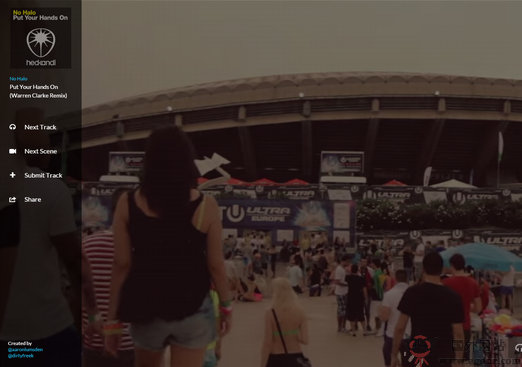 打开HouseParty FM 网站后会自动播放随机的音乐,你可以在左侧点击“Next Track”进行下一曲播放,也可以点击“Next Scene”来改变视频片段,也就是说你可以单独切换音乐或者视频,让这些音乐和视频符合自己的观念。