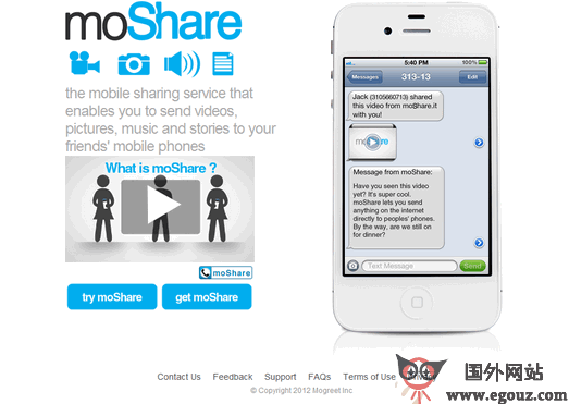 moShare将让在移动设备上分享视频、图片、音乐、文章以及其它富媒体信息更快捷,它允许内容发布商、APP开发者、博客以及广告主向任何移动设备分享内容,而无需考虑商和设备的类型。内容发布商可以非常简单的将Mogreet的分享按钮放置在自己的网页或者博客上,因此可以直接向读者的移动设备分享内容。同时它还具有分析功能,可以让你追踪分享内容的具体情况。