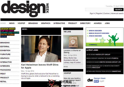 DesignWeek:英国图形设计周刊是英国的一个致力于图形、数字化、室内、、设计新闻和招聘的设计周刊网站,由半人马通讯有限公司创办,通过世界各地的设计师分享的经验和技术,让你了解世界各地的设计行业发生的新闻事件。