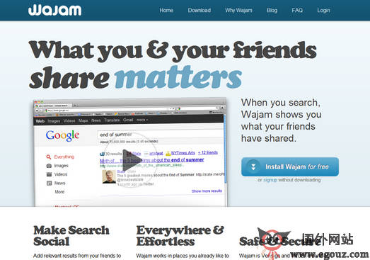 Wajam:社会化社交是一个将其社交搜索工具整合进Google,Yahoo,Bing及其它主流搜索引擎的搜索页面中,索引所有社交网络的状态更新以及你朋友在Twitter,Facebook及Google+上的分享链接。