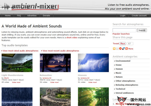 Ambient Mixer:大自然意境图片音效网是一个汲取了大自然界中各种声音的网站,通过图片中添加各种大自然音效,来营造一种很轻松的意境中去,可以自己调试音效。