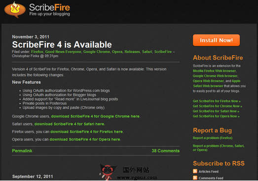 ScribeFire:基于浏览器博客写作发布工具是一款优秀的浏览器扩展插件工具,它几乎支持所有的博客平台,它可以让你在不登录博客后台的情况下直接撰写并发布,目前支持多浏览器(Firefox,Chrome,Opera,Safari),小巧易用。 ScribeFire是一款浏览器扩展。但是 ScribeFire 支持各大主流浏览器,Firefox,Chrome,Opera,Safari。同理,ScribeFire 自然支持全平台。ScribeFire编辑器本身自带大量的功能,并且同样支持插入标签、文章归类等等操作。 ScribeFire插件特点: 1、可以方便的插入 AdBull 广告代码(用来赚钱); 2、多博客管理; 3、支持文章模板; 4、代码状态下支持 Markdown 语法; 5、支持右键分享文章,链接等; 6、支持管理已发布的博文; 7、支持分屏,一半是正在浏览的网页,一半是日志编辑(FF浏览器下)。 让您轻松发布日志到您的博客,支持大部分博客系统,当然也包括Wordpress,功能强大,完美结合各种主流浏览器,与WindowsLiveWriter相比小巧方便,可以离线写日志,在线再发,方便一稿多投,可调用博客模板预览效果。
