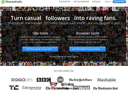 Shareaholic:社交内容发现及分享平台是一个支持200个社交网络的书签分享工具网站,汇集了互联网中各大知名媒体的分享应用,你可以通过安装这个插件实现在这些网站上面进行书签的分享或信息的分享。 Shareaholic是一个社会化书签集成Firefox插件。Shareaholic集成了Digg、FaceBook、Google BookMarks、Reddit、StumbleUpon、Twitter等目前主流的书签服务和网络服务。 所谓的分享工具就是指在浏览器上提供一个按钮,按一下按钮之后就可以直接把你目前正在浏览的网页转贴到twitter、Facebook、噗浪..等社群网站,或透过Gmail、Yahoo!信箱、Hotmail等邮件收发服务转寄,甚至还可支援各式各样的部落格服务、书签网站与有的没的分享网站…等等,对于喜欢分享的人来说,这类工具真的相当方便。 Shareaholic is transforming the way we read, discover and share content on the web.Founded in 2008, Shareaholic has quickly grown from a "nights and weekends" project to a fast-growing VC backed company that today is the leader in making content discovery & sharing on the web a simple, delightful and elegant experience for readers while providing powerful tools to content publishers to measure, analyze and improve the effectiveness of their content to drive even more visibility, traffic, leads and views. Through web browser extensions, open platform APIs, and one of the largest and fastest growing networks of content publishers, Shareaholic reaches over 350 million people across every continent each month. Or put another way, if Shareaholic was a country, it’d be the 4th largest country in the world.