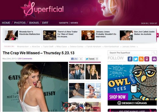 SheSuperficial:明星娱乐八卦新闻网是Buzzmedia 娱乐公司旗下的网站之一一家名人名流绯闻网站,主要发布与娱乐圈,名人名流相关的绯闻、谣言、娱乐新闻报道、图片等。SheSuperficial(译名表面文章)是一个成立于2004年,以名人界的八卦为主要内容,是芝加哥论坛评选出的五大最好的报道名人新闻的网站之一。该网站不同于E!在线(E! Online)和美国名人消息网(TMZ.com)等传统八卦网站,它以尖锐的视角,讽刺了名人界的虚假行为,因而也备受关注。They come because SpinMedia understands the complex relationship between brands, content and millennial consumers. We provide a platform that feeds their obsession with music and pop culture – and incentivizes them to share stories, join communities, and explore.