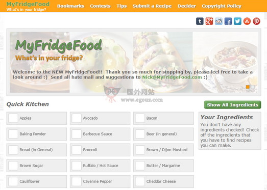 我冰箱里的食物(My Fridge Food)是一个根据现有的食材来选择合适的菜谱的站点,不管你有什么食物都可以通过该网站来筛选出合适的菜谱,然后根据教程烹制出美味可口的菜品。 打开网站后你会看到很多厨房里常用的食材,用户只需要把自己有的材料打勾即可,然后点击“查找菜谱”按钮,系统会自动筛查出相关的菜谱,即使你选择苹果和辣椒也能匹配出对于的菜谱,至于什么滋味那就自己试试吧。