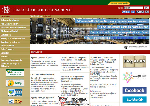 巴西国家图书馆 (Fundacao Biblioteca Nacional = Brazilian National Library)原名皇家图书馆,成立于1810年10月29日。同时颁布饬令宣告皇家图书馆作为皇室财产,供宫廷及大臣使用。为了能向学者进行咨询,逐渐向学者开放。首批藏品包括图书、手稿、版画、地图、钱币和勋章总计60,000件源于葡萄牙宫廷,是1808-1809年葡萄牙王室逃往巴西时带去的书籍。