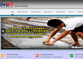 菲律宾教育部(Department of Education)分为初等教育局、中等教育局和高等教育局三个部分。该网站为菲律宾教育局的官方网站,主要提供部门介绍、教育计划、教育新闻、教育预算、教育数据等内容,网站语言为英语。
