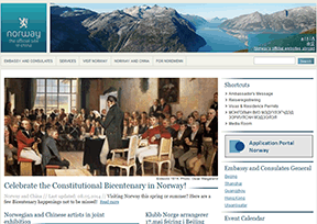 该网站为挪威驻华大使馆(Norsk Ambassade in China)的官方网站,主要提供使馆简介、大使信息、最新动态、关于挪威、学习与工作、旅游景点、时事新闻、签证与其他许可证业务等。网站语言有中文和挪威文两种版本。