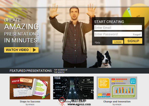 Emaze 的界面非常简约。首页主要由 3 部分组成:视频介绍、作品展示以及登陆框。从登陆框的设计就知道 Emaze 的设计非常用心,上面只有两个输入框,账号邮箱和密码,无论是新老用户均只在此输入这两部分,老用户输入后点击登录按钮进入下一页面,新用户输入完成后点击注册亦能进入个人主页,非常简洁明快。