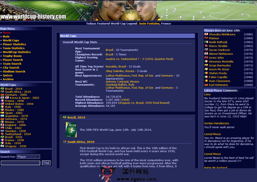 Worldcup History:足球世界杯历史资料百科是一个记录了足球世界杯历史资料的站点,从1930年第一场比赛开始,到目前最近的赛事都有详细的记录,你可以查询到获得世界杯次数最多的国家,进球数...