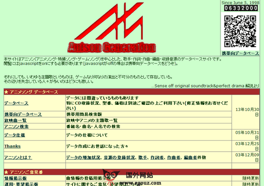Anison info:日本动画歌曲大全是日本的一个老牌的日本动画、日本游戏中的歌曲、音乐、伴奏等音乐素材资源,该网站历史悠久,可以找到日本所有的的动漫音乐资源。...