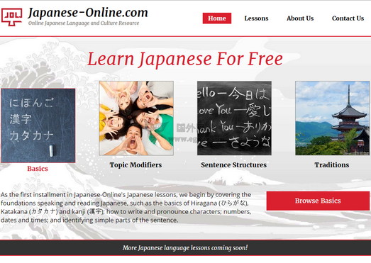Japanese Online 是一个提供学习日本语言与文化的资源和机会的学习网站,它建于1996年,网站所有资源均为免费。它适合各种水平的学习者,不管是刚起步的初学者,还是已有多年经验的用户,在...