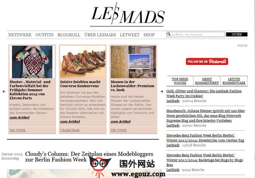 德国Lesmads时尚博客是一个致力于关注国际时尚界流行趋势的博客站点,汇集介绍热门购物、街头风格、时装秀、模特、时尚新闻、时尚摄影等,为用户解读时尚潮流的最新趋势。...