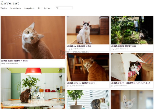 I Love Cat 是日本的一个以猫为主题的在线杂志,提供了很多有意思的猫主访谈、猫的摄影和一些主题活动。猫是日本民族最喜爱的宠物,在日本人心目中有着特殊的地位,他们喜欢借助猫来表达...