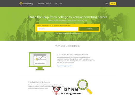 CollegeFrog:在线高校会计招聘服务网是一个针对会计专业的毕业学生创办的招聘求职网站,通过该平台会计专业的学生可以创建自己的简历就可以一站式的发布出去,而不必再各大求职网站再次发布简历了。CollegeFrog联合的全国各地的企业和会计专业的高校,通过该平台新毕业的学生在这里简历一份档案 ,企业就可以直接通过该平台进行专业对口的招聘了,普通的高校招聘方式即耗...