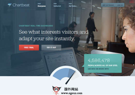 ChartBeat:在线网站实流量统计平台是一个提供网站实时统计服务,可以实时的现实网站的流量统计分析平台,除了提供实时网站访问人数以外,还可以显示哪些网页被访问最多,哪些网页在Twitter里传播最多,页面的平均载入时间等等。Chartbeat公司重新设计了软件并且获得了950万美元B轮融资,重新设计的软件不再局限于仅仅为网站提供某个时刻网站流量或文章访问量。在新的主界面...