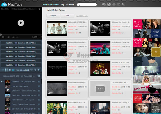 Muzitube 网站是一个在线免费收听音乐的站点,该网站主要抓取Youtube网站上的MV资源,还有用户上传的音乐文件,同时还整理KKBox排行、HiTO排行、美国广告牌排行等音乐数据,对于喜欢收听国外音...