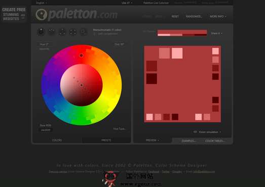 Paletton:在线配色方案设计网是一个成立于2002年的颜色配色工具,帮助平面设计师和网页设计师选择理想的配色方案,打开网站即可选择一种颜色,然后系统自动生成配套的色系供设计师使用。...