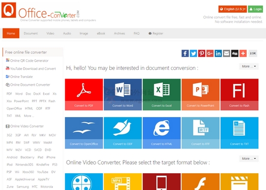 Office Converter 是世界上最大的在线文件转换工具集合网站,你能免费在线转换包括视频、音频、图形、文档和压缩等服务,目前能够做到输出超过500种格式,输入格式转换超过2000种不同的格式转...