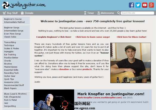 JustinGuitar:贾斯汀免费吉他教学网是由英国伦敦西部的一位吉他老师,也是Youtube网站上最火的吉他教学明星,开办这个网站的目的是提供免费的吉他教学视频资源,让想学吉他的用户找到可以免...