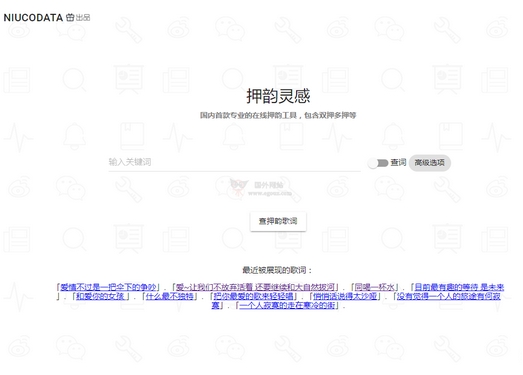 押韵灵感是一个基于在线版的专业押韵词、歌词查询系统,包含双押、多押押韵的句子等,提供押韵表、押韵词、押韵句子的在线匹配,用户只需要输入关键词即可获取非常押韵的句子。...
