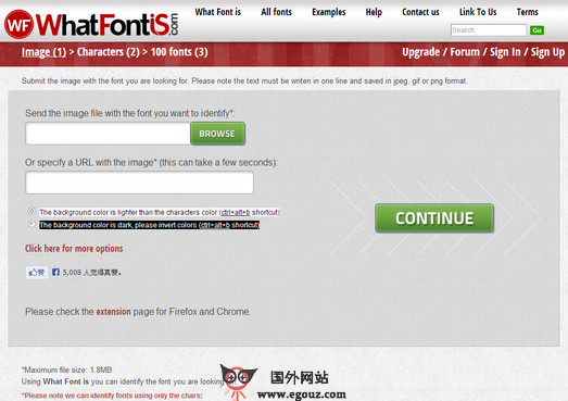 WhatFontIs:在线图片字体识别工具是一款可以查找图片上字体的工具,上传一张带有文字的图片后,改工具会自动查找图片上面说使用的字体,与查字体的网站类似。支持Firefox和Chrome浏览器的扩展...