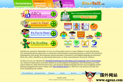 Starfall是一个非常有名的儿童语音教学网站。创始人Stephen Schutz在幼年时有阅读障碍,所以长大后,与他人共同创建了Starfall。网站面向的是学龄前以及低年级儿童,通过语音及趣味动画的方式来...