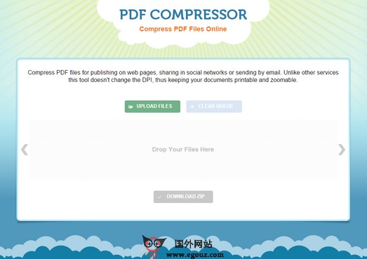 PDFCompressor:在线PDF压缩工具是一个提供PDF文件高压缩的工具网站,方便用户把高压缩的PDF文件发布在网站上,或者在社交网络中分享,通过邮件来发送压缩后的文件,该工具不会改版PDF的DPI质量...