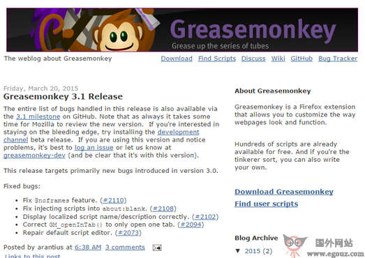 Grease Monkey 是由Mozilla Firefox的一个附加组件衍生而来,它让用户安装一些脚本使大部分HTML为主的网页于用户端直接改变得更方便易用。随着Greasemonkey脚本常驻于浏览器,每次随着目的网页打开而...