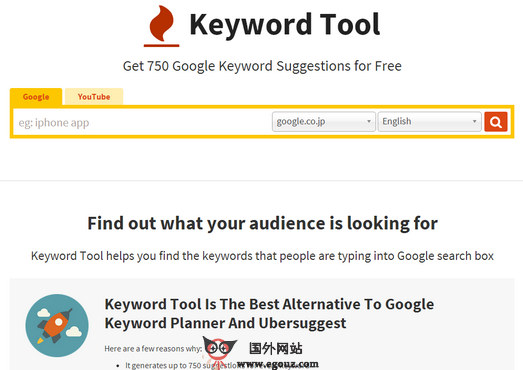 KeywordTool:在线谷歌关键词分析工具是一个帮助站长挖掘和分享谷歌关键词的在线工具,你只需要输入想要查找的关键词和所在的谷歌所在地区就可以针对不同的地区进行查询相关的关键词,是国...