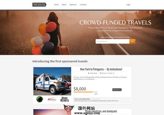TrevolTa:在线旅游众筹平台是一个全球性的资助式旅游平台,让用户提交自己的探险旅游计划,然后筹集资金进而实现自己的梦想,筹集成功的人需要分享自己在旅途中的照片、笔记和视频等内容,以保持较高的社会化关注度。...