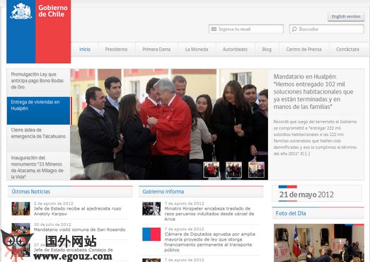 GobiernoDeChile:智利政府官方网站是智利国家的政治权利机构官方网站,提供西班牙语、英语两种版本,内容包括总统及第一夫人简介、府邸概况、政府机构设置简介、博客、新闻中心等。...