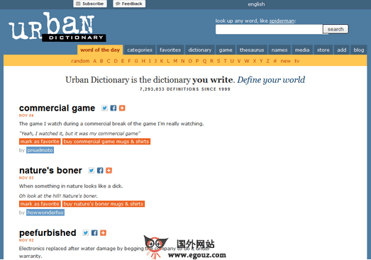 UrbanDictionary:互联网单词语义诠释网是一个专供网友发表一些特殊单词或短语解释的平台,这上面有许多正常词典里面查不到的词条,即使是正常词典里面有的,在这里也会有新的精辟解释。网友们还可以对每一个词条进行投票。互联网是一个创造大量词汇的地方,什么样的词汇都会出现,有那么有些人他们专门对网络上产出的词汇进行诠释,解读它们的意思,这些词汇源于生活...