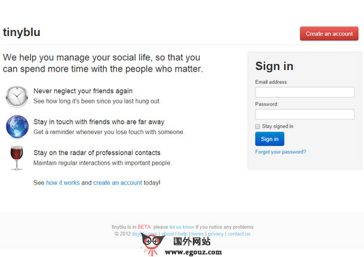 Tinyblu: 社交网络关系提醒管理平台是一个可以帮助我们管理自己的社交生活的工具,通过该平台来追踪好友的动态,提醒你好友与自己的联系,强化因为忙碌的生活而忽略亲人、朋友间的关系。我们大多数的人都在专注于工作,留给自己、朋友好家人的时候很少,在空余的时间里才会关注社交网络中的好友动态,通过Tinyblu工具你可以看到三种不同的表情:绿色、黄色和红色,绿色...