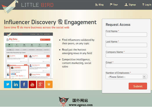 GetlittleBird:社会化营销推广工具是一个帮助企业和营销人员通过社交网络来把自己的服务传播到更远、更合适的地方,让自己的产品和服务通过口碑的方式分享给更多的用户群体。目前,Little Bird 的客户已经拓展到了诸多领域,其中不乏世界五十强的大公司。Little Bird 通过三步来实现:找到相关话题的专家、分析和确立合适的专家、进行内容传播。当你要传播一个话题时,首先需要...