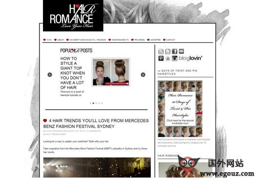 HairRoMance:浪漫发型创意设计分享网是一个分享美发发型的网站,爱美是女人的天性,爱生活更爱美发,关注国外最流行的创意发型,教你如何更好的打理你的头发,美女们不要错过。关于这个网站的介绍和创建人的故事可以参考下面的英文介绍:Hi! Im Christina and welcome to my Hair Romance.There are so many things I love about life, but hair is definitely high on my list. But what else is there, I hear you ask. Very g...