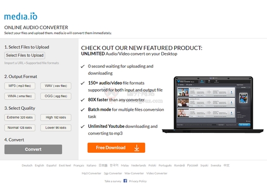 Media io 是一个支持在线音频格式转换的工具,支持的输出格式有MP3、WAV、WMA、OGG,可选择的音频质量有320kbit s、192kbit s、128kbit s、96kbit s,让用户无需安装任何工具即可实现在线转换。...