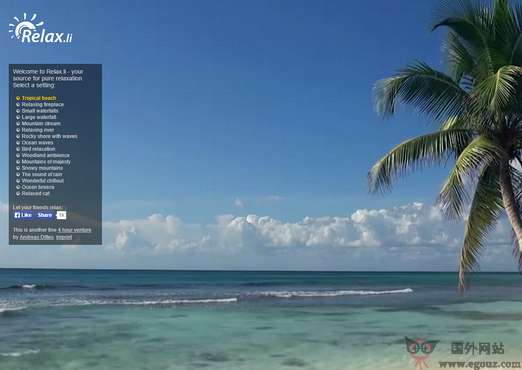 Relax:在线放松自然音效网是一个致力于音效理疗的网站,提供海浪、木头燃烧、大海音效、流水音效、鸟叫虫鸣音效的动态视频资源,让你在工作完成只会放松自己的心情,之前我们也推荐过不...
