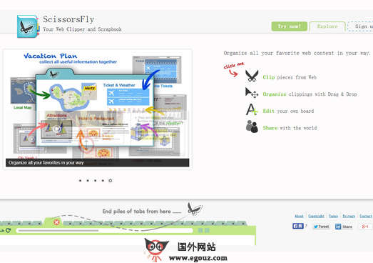ScissorsFly:在线剪切编辑工具是一款基于网络WEB2.0体验的在线剪切工具,用户无需安装任何插件即可在线剪切想要的图片、网页,可以自定义剪切样式,全屏剪切、无规则剪切,剪切完成后还可以进行编辑,例如添加文字描述,上传到其他云存储等功能。使用ScissorsFly工具非常简单,你也可以在线体验试试看,喜欢的话,直接注册成为会员就可以保存你所剪切和编辑的图片内容了。...