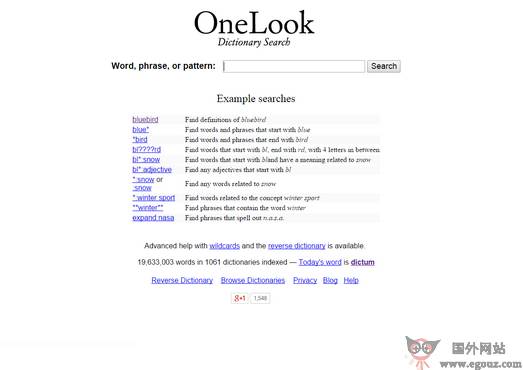 OneLooK 网站是一个具有庞大数据库的英文单词、词汇表数据库,收录了955部词典和词汇表,单词6百多万个,OneLook词典一次能够查询到各个词典的释义,如需更加详细的解释可直接选择你喜欢的...