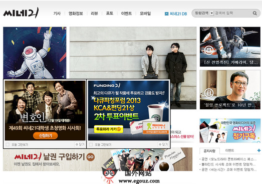 韩国Cine21电影杂志是韩国著名的电影了杂志网站,该杂志每周出版一次,主要介绍电影首映、电影人访谈、电影评论等相关报道。建有电影作品和电影人的专门数据库,可说是高水准的专业性电...