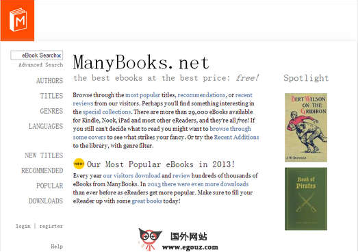 ManyBooks:在线多格式免费电子书分享网是一个提供了近30000册多格式电子书籍的网站,支持iPad、iPhone、智能手机和电子书阅读器下载使用,该平台加入了古藤堡计划,任何人都可以使用他们提供的电子数据而没有版权限制。ManyBooks成立于2004年,经过不断的努力和更新,已经有较高的知名度,用户可以通过书籍标题、作者名称和类型进行查找相关的免费书籍,同时也会公布年度最受...