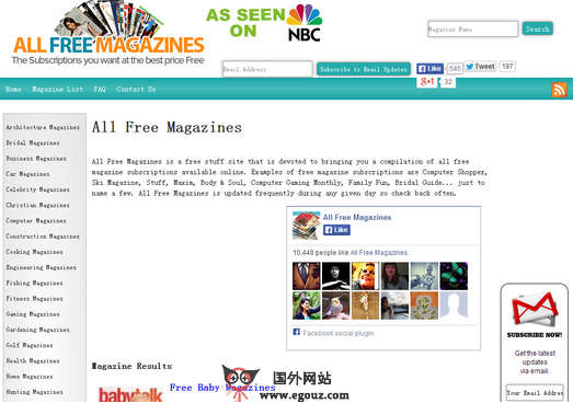 All Freemagazines:在线免费杂志订阅平台是一个提供在线杂志免费订阅和下载的站点,收录了互联网上知名的杂志,例如建筑杂志、商业杂志、汽车杂志、名人杂志、电脑杂志、健身杂志、园艺杂志、游戏杂志等35个分类,可以说几乎涵盖了网络上所有的杂志。All Free Magazines is a free stuff site that is devoted to bringing you a compilation of all free magazine subscriptions available online. Examples of free magazi...