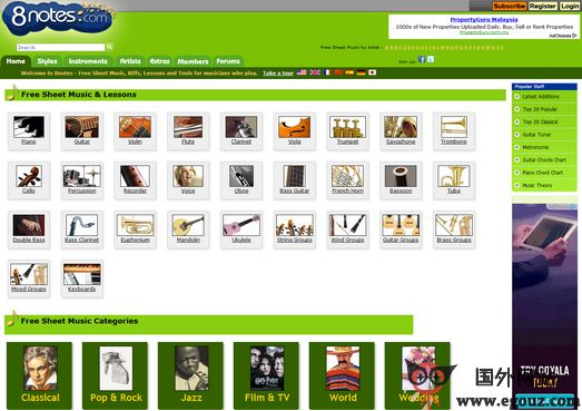 8Notes:免费乐器乐谱分享下载网是一个提供主修乐器的免费乐谱下载网站,该网站提供吉他和弦表、钢琴和弦表;每个和弦都以音频文件做成将Midi文件转换为活页乐谱,将Tab转换为活页乐谱,将Tab转换成Midi文件。8Notes网站成立于2002年初,提供的乐谱适合所有主修乐器,所有音乐风格。8notes是Red Balloon Technology公司的旗下网站,后者是一家音乐和科技公司,位于英国的圣奥尔本斯。...