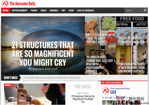 The Awe Some Daily 网站是一个致力于互联网新奇、有趣、励志的故事媒体,每天通过先进的筛选机制来收录最有意思的文章、视频内容,主要栏目有娱乐、搞笑、动物、艺术、美食等。让你轻松每一天。...